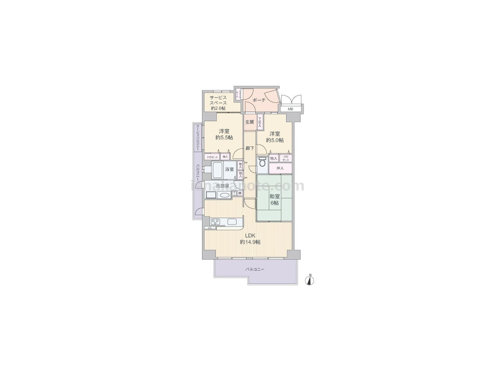 専有面積75.51平米の3SLDK。住居の窓が共用廊下に直接面していない、プライバシーに配慮されたプラン。和室6帖は、LDK側の襖を開放すれば約20.9帖大の空間としても使用出来ます。対面・カウンタータイプのキッチン横にはバルコニーへの勝手口付き。洗面室・浴室にも窓があり、換気がしやすく快適です。各居室と室内廊下、専用ポーチ内にトランクルーム付き。サービススペース約2.6帖は、ドレッサー置場や書斎の利用によさそう。バルコニーは約13.97平米あります。