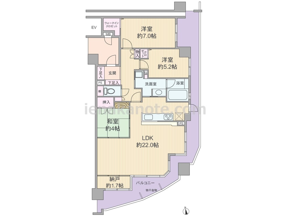 専有面積85.7平米の3SLDK。居室の窓が共用廊下に面しておらず、玄関前にアルコーブが付いたプライバシー重視のプラン。二面採光のLDKは約22.0帖大と広く、コーナーサッシも用いられており明るく開放感があります。和室の襖と納戸約1.7帖の扉を開放すれば、LDKをより広く使用可能。キッチンは料理をしながら家族とコミュニケーションが取りやすい対面カウンタータイプ。洗面室、バルコニーへの動線も確保されています。各居室と室内廊下に収納スペース付き。浴室はバルコニーに面して窓があり、換気がしやすく快適。バルコニーは約26.23平米とゆとりがあり、ガーデニングをたっぷり・のびのびと楽しめます。
