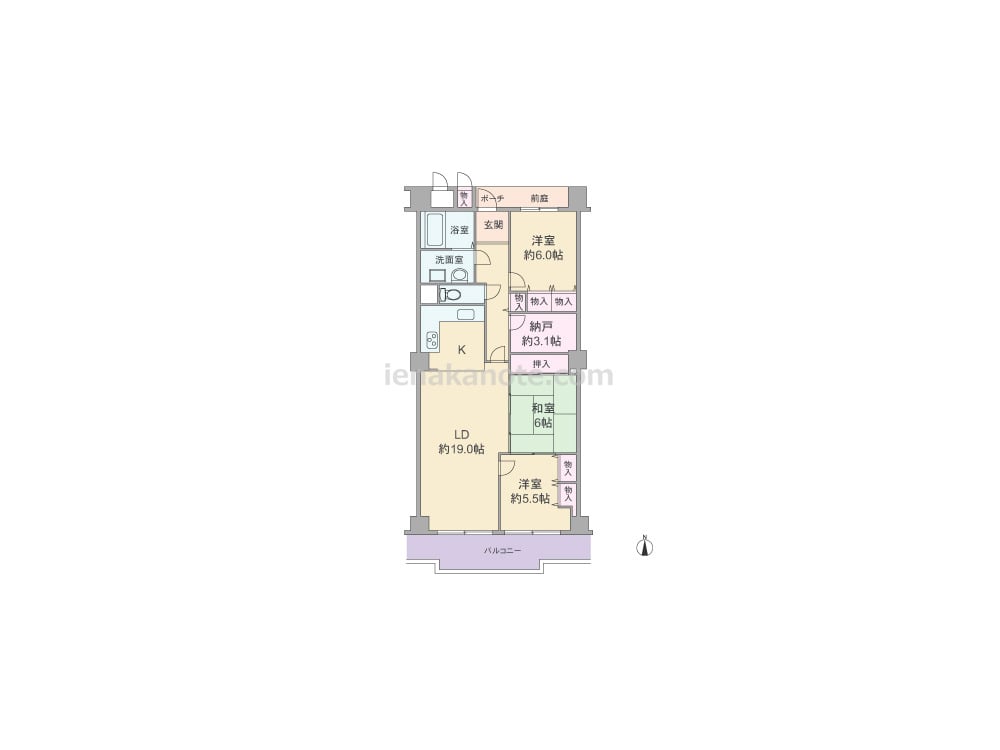 専有面積93.63平米の3SLDK。共用廊下と玄関・居室の間にはアルコーブ・前庭があり、共用廊下に面して物入付き。キッチンはL字型。和室6帖はリビング・ダイニング約19.0帖と洋室約5.5帖と続き間になっており、襖を開放すれば部屋を広く使う事もできます。各居室と室内廊下のほか、納戸約3.1帖もあるなど収納スペースが豊富です。