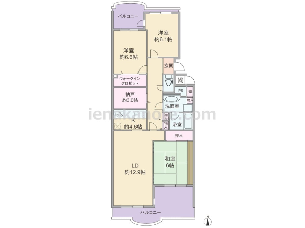 専有面積92.70平米の3SLDK。センターインのプランで南北両面バルコニー付き。キッチンは独立型・壁付けタイプです。LDKと和室は続き間のため、襖を開ければ和室はリビングの延長部分として繋げて利用可能。和室前部分はバルコニーの出幅が一部広くなっており、ガーデニングものびのび楽しめます。大容量の納戸があり、収納スペースが充実しています。