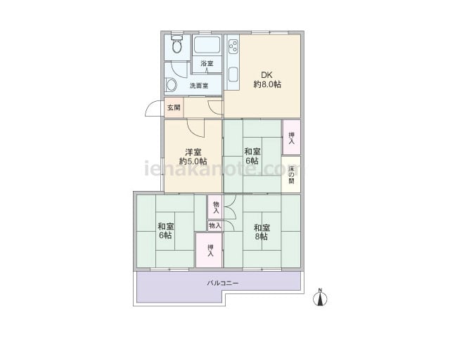 専有面積70.92平米の4DK。センターインのプランで、トイレと浴室も窓付き。ダイニング・キッチンは北側に配置されています。全部屋が続き間で、生活シーンに合わせてフレキシブルに使用できます。