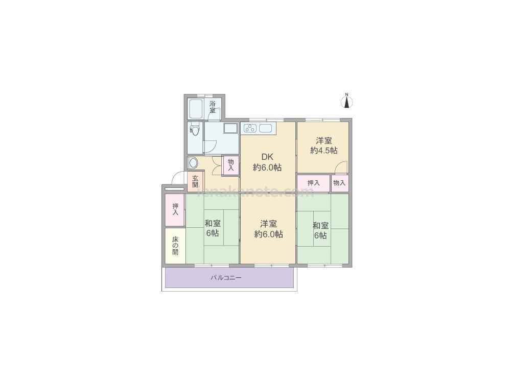 専有面積65.40平米の4DK。共用廊下に面する居室のないセンターインのプラン。南側に3室が面し、浴室とキッチンにも窓付き。各部屋続き間のため、生活シーンに合わせてフレキシブルに使用できます。