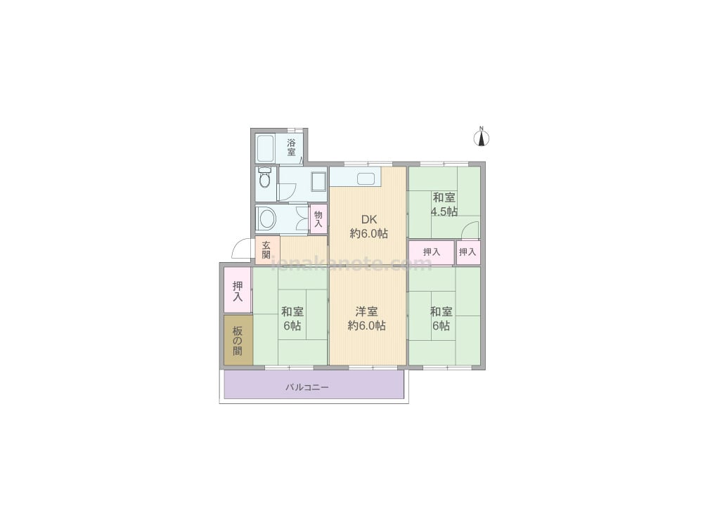 専有面積65.4平米の4DK。センターイン、ワイドスパンのプランで、南側に3室が面し、浴室とキッチンにも窓付き。全部屋が続き間になっており、生活シーンに合わせて、フレキシブルに使用出来ます。