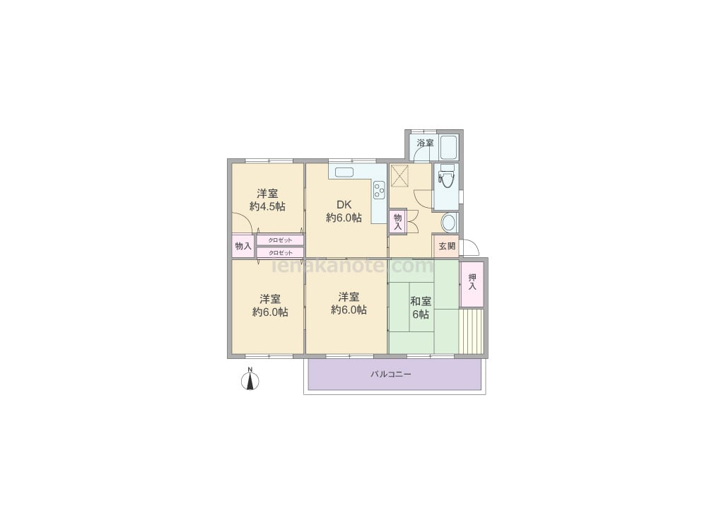 専有面積65.40平米の4DK。センターイン、ワイドスパンのプランで、3室が南向き。浴室、トイレ、キッチンにも窓があり、換気、採光にすぐれ快適です。キッチンは使いやすいL字型。全居室が続き間のため、生活シーンに合わせてフレキシブルに使えます。