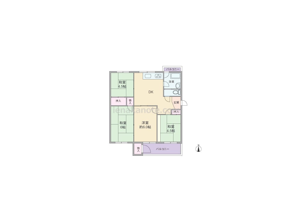 専有面積55.00平米の4DK。玄関を入ってすぐにダイニングキッチンがあり、ダイニングを通って各居室へアクセスするため、家族のコミュニケーションの機会が増えるプランです。各居室はそれぞれ独立して配置されており、家族間のプライバシーは確保されています。浴室に窓があり換気がしやすく快適。各部屋に収納スペース付きで、バルコニーにも物入があります。