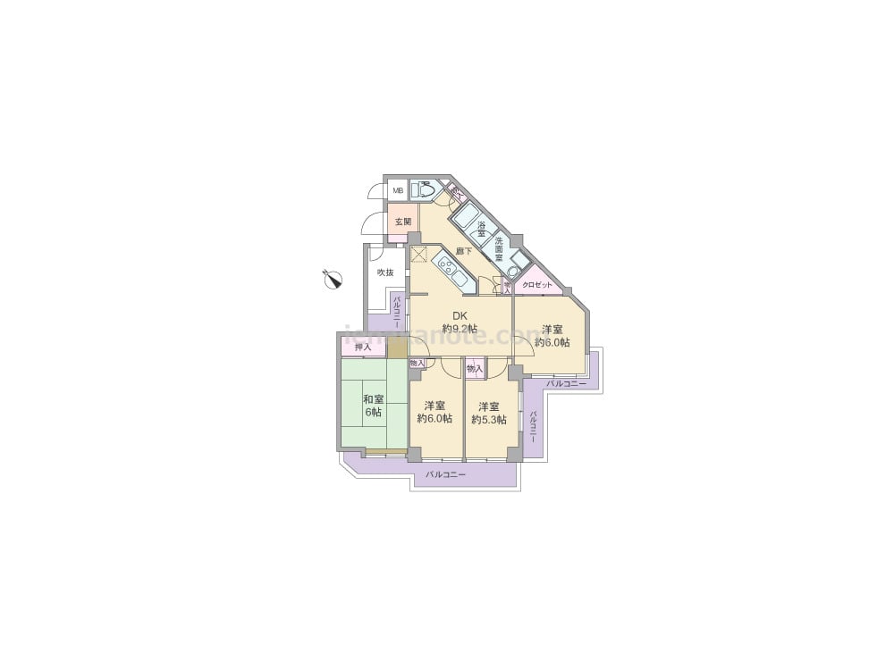 専有面積73.55平米の4DK。居室の窓が共用廊下に面しておらず、玄関から居室を見通せない造りでプライバシーが確保されています。ダイニングスペースを通って各部屋にアクセスする、家族のコミュニケーションの機会が増えるプラン。洋室約5.5帖と洋室約6.0帖の収納スペースは容量が少ないため、収納家具を置くなど少し工夫が必要。玄関とキッチンには吹抜に面して窓がり、3カ所あるバルコニーはガーデニングを楽しむのによさそうです。