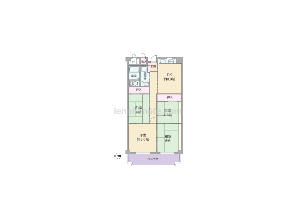 専有面積78.18平米の4DK。DKは約8.0帖、キッチンは壁付け・オープンタイプで、キッチン前に窓があります。DK以外は続き間になっており、バルコニーに面する洋室約8.0帖、和室6帖には収納スペースが無いため、家具を置くなど少し工夫が必要です。トイレは洗面室を通って出入りするため、トイレ・洗面室使用時の動線が重なっています。