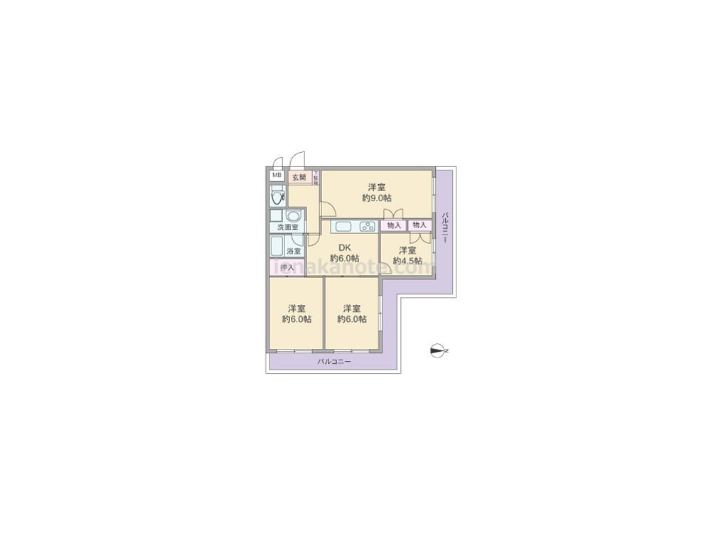 専有面積65.84平米の4DK。共用廊下に居室の窓が直接面しておらず、プライバシーが保たれています。主寝室はゆとりの約9.0帖大。主寝室以外へはダイニングキッチンを一度通ってからアクセスするため家族のコミュニケーションが増えます。北東側の洋室約6.0帖は2面採光ですが、物入が無いため、扉を外してリビングスペースとして利用しても良さそうです。またバルコニーは約20.88平米の広さがあり、ガーデニングを楽しむのにもぴったりのスペースです。