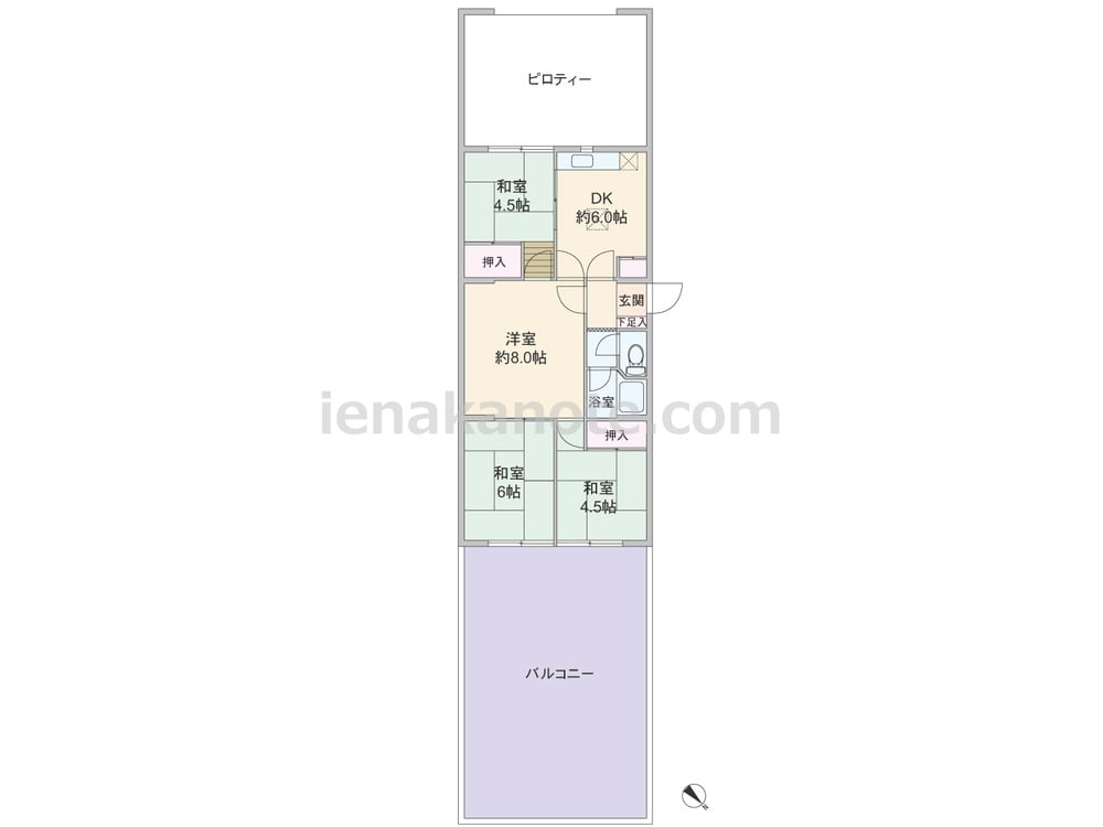 専有面積60.45平米の4DK。DK約6.0帖には和室4.5帖が隣接しており、引き戸を開放すれば10.5帖の空間に利用出来ます。洋室約8.0帖は和室二部屋への動線上に位置するため、個室としての利用より、家族が集うリビングスペースの利用によさそうです。和室6帖には押入がありませんが、その他の居室とDKに収納スペース付き。ピロティー約21.28平米、バルコニーは約42.56平米と大変広く、ガーデニングやアウトドアリビングによさそうです。