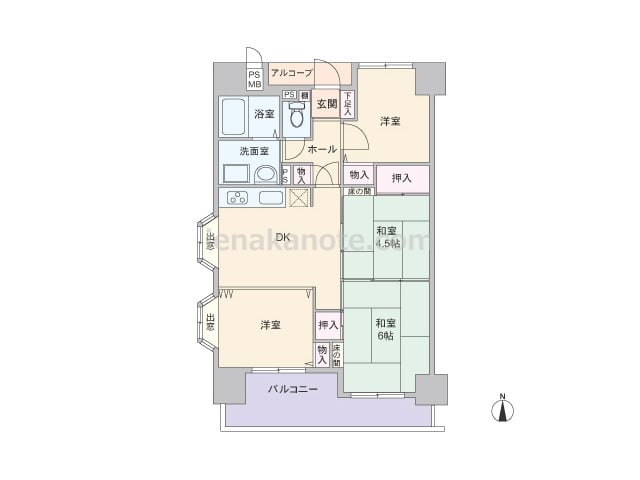 専有面積67.68平米の4DK。センターインのプランで、南北両面にバルコニー付き。キッチン、浴室、トイレにも窓があり、換気がよく快適。続き間が多く、生活シーンに合わせて、フレキシブルに使用可能。収納スペースも豊富です。