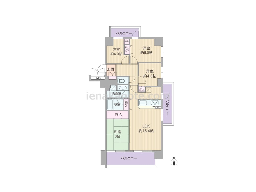専有面積78.12平米の4LDK。廊下面積の少ないセンターインのプランで、LDKは15.4帖の広さがあり、キッチンはカウンタータイプ。キッチンからバルコニーへ出入りできる勝手口が付いています。