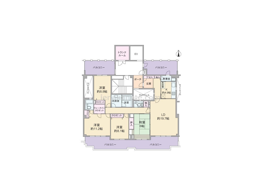 専有面積146.71平米のゆとりの4LDK。共用廊下に直接面する居室が無く、住戸前の廊下を他の人が歩くことが無いため、プライバシーが確保され、共用廊下に面して大容量のトランクルーム(7.10平米)付き。南北両面にバルコニーがあり、出幅もある為、ガーデニングスペースやアウトドアリビングとしても空間を楽しめます。リビング・ダイニングは広々19.7帖大、キッチンは独立タイプで、すぐ横には便利な家事室があり、直接バルコニーへ出られます。主寝室にはウォークインクロゼットと、専用のサニタリールーム付き。キッチン・浴室・トイレには吹抜けに面した窓があります。洗面室にはトップライト付き。LDKや洋室は折上げ天井になっています。