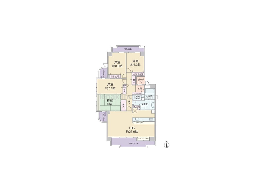 専有面積112.22平米の4LDK。センターインのプランで、4カ所にバルコニー付き。全部屋がバルコニーに面し、明るく、開放感があります。キッチンはカウンタータイプで、洗面室に直接アクセスできるツーウエイ。全部屋6帖以上の広さがあり、LDKは約23帖大。バルコニーはゆとりがあり、ガーデニングも楽しめます。