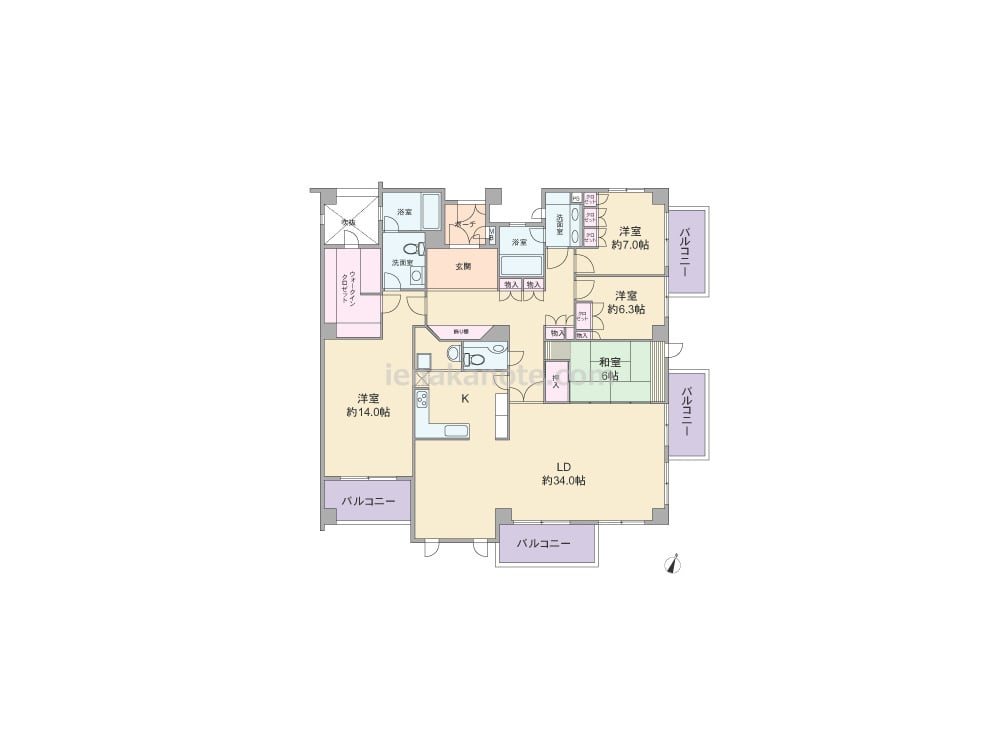 専有面積199.4平米の4LDK。玄関前にポーチ付き。全部屋6帖以上の広さがあり、リビング・ダイニングは約34帖、主寝室は約14帖大。主寝室には大型のウォークインクロゼット付きです。4カ所にバルコーがあり、リビングは開放感のある2面採光。キッチンは使いやすいL字型のカウンタータイプで、家事動線にすぐれたツーウエイ。浴室と洗面、トイレが2カ所にあります。