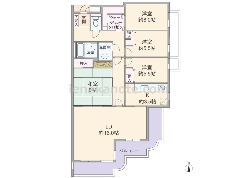 専有面積112.03平米の4LDK。共用廊下に直接面する居室が無く、プライバシーに配慮されています。LDは広々16帖、横長リビングで開放的。キッチンは独立タイプで、窓があるため換気がしやすく、洗濯機置き場もある家事効率の良いプラン。大容量の物入れがあり、主寝室8帖に繋がっています。
