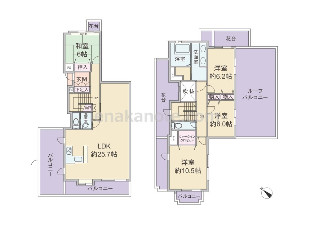 専有面積152.97平米の4LDK。玄関上部は吹き抜けになっており、開放感があります。LDKは約25.7帖と非常にゆったり。下階の和室6帖は離れのような感覚。全室6帖以上で、上階の主寝室は約10.5帖。3方に窓、ウォークインクロゼット付き。39.84平米のルーフバルコニーは子どもの遊び場にも活躍しそう。上下階どちらにもトイレ、洗面室があり、上階の洗面台はダブルボウルで忙しい朝も、混雑することなく快適。