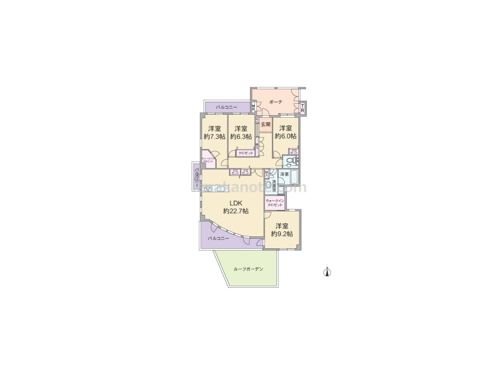 専有面積114.9平米の4LDK。全室6帖以上で、主寝室は約9.2帖とゆったりしています。玄関前には専用ポーチとトランクルーム付き。バルコニーは、南・西・北の3方にあり、南側にはルーフガーデンもついています。LDKは22.7帖の広さで、アールを描く壁面がより開放感を演出しています。各室収納付きで、主寝室にはウォークインクロゼットが。このウォークインクロゼットを通って、主寝室から直接洗面室へ入ることもできます。約7.3帖の洋室にもウォークインクロゼット付き。窓も多く、約6.0帖の洋室以外は2面採光を確保。どの部屋も直接共用廊下に面していないため、独立感の高いお部屋です。
