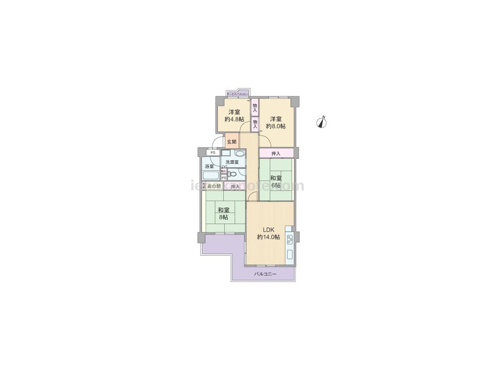 専有面積96.5平米の4LDK。8帖の居室が2部屋あるゆとりのセンターインのプラン。南北両面にバルコニー付き。キッチンは壁付けのオープンタイプで、バルコニーに面して配置されている為、明るく、開放感があります。各部屋に収納スペース付き。バルコニーは出幅があり、ガーデニングもたっぷり楽しめます。