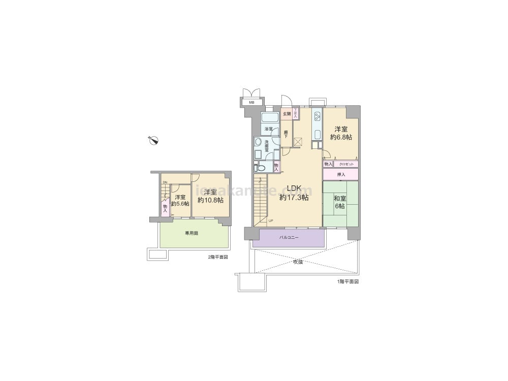 専有面積101.02平米の4LDK。メゾネットタイプ。リビング・ダイニングが中央に配置され、家族のコミュニケーションの機会が増えます。キッチンはカウンタータイプ。浴室にも窓があり、換気がよく快適です。