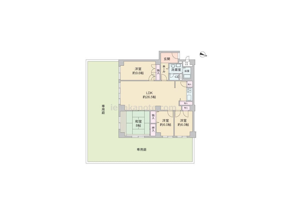 専有面積124.78平米の4LDK。全部屋6帖以上の広さがあり、LDKは約26.5帖大。収納スペースも充実しています。全部屋が広々とした専用庭に面し、専用庭はガーデニングや家庭菜園、子どもの遊び場など様々な楽しみ方が出来ます。