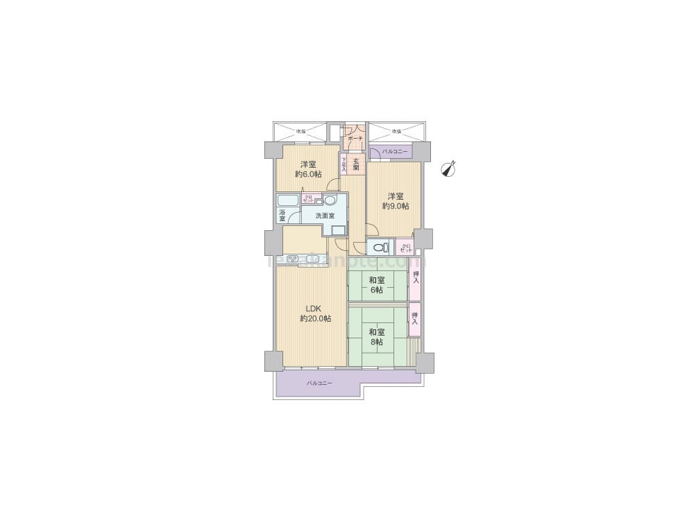 専有面積111.90平米の4LDK。共用廊下との間に吹き抜け、ポーチ、バルコニーがあるプライバシーに配慮されたプラン。全部屋6帖以上の広さがあり、主寝室は約9帖大。キッチンはカウンタータイプ。LDKと和室2部屋が続き間で、生活シーンに合わせてフレキシブルに使用可能。南側バルコニーは一部出幅があり、ガーデニングもタップリ楽しめます。
