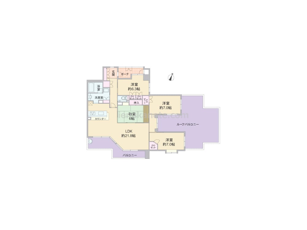 専有面積110.28平米の4LDK。玄関前にポーチが有り、室内への動線がL字になったプライバシーに配慮されたプラン。全部屋6帖以上の広さがあり、LDKは約21.8帖大。キッチンはカウンタータイプで、洗面室に直接アクセスでき、家事動線にすぐれています。7帖の洋室2部屋は開放感のある2面採光。一部洋室に挟まれる様にルーフバルコニーがあり、アウトドアリビングやガーデニングスペースとしても空間を楽しめます。