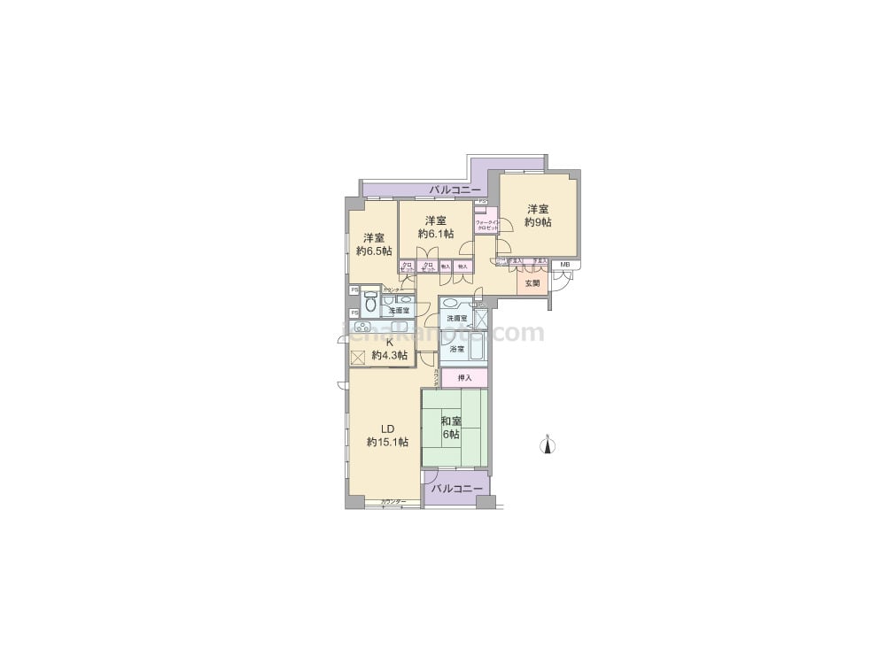 専有面積110.75平米の4LDK。南北両面バルコニー付き。LDは15.1帖、キッチンは独立タイプ。全室6帖以上でゆとりの広さ。主寝室は9帖と広く、ウォークインクロゼット付きです。各室に収納があり、収納スペースが充実しています。