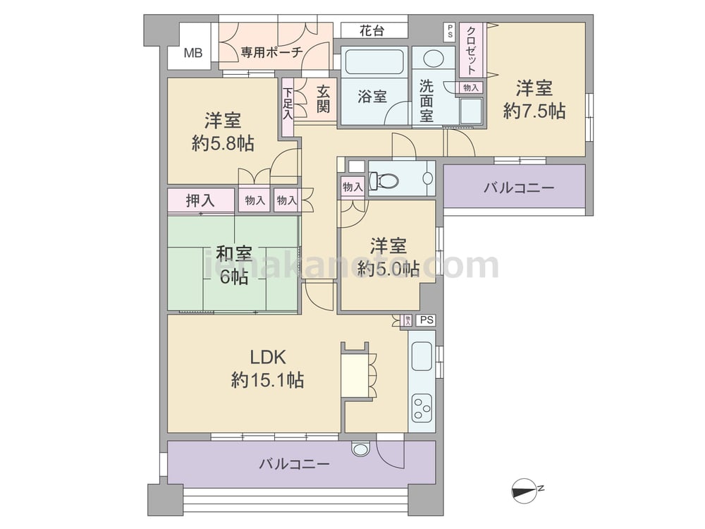 専有面積89.79平米の4LDK。角部屋、ワイドスパンのプランで、LDKと主寝室約7.5帖がバルコニーに面し、主寝室は二面採光。玄関前にはプライバシーに配慮されたポーチがあります。キッチンはバルコニーに面して配置され、窓と勝手口付き。LDKと和室が続き間の為、約21.1帖の一つの空間としても使用可能。浴室にも窓があり、換気がよく快適。ゆとりのあるバルコニーでは、ガーデニングも楽しめます。