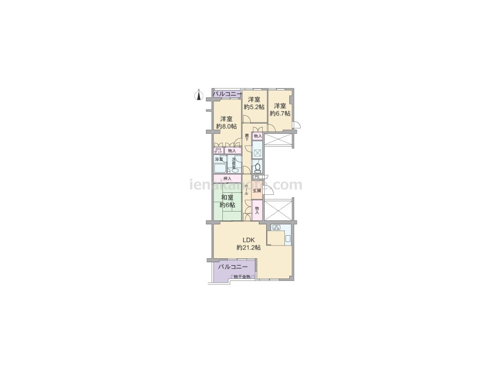 専有面積109.45平米の4LDK。センターインプランで、南北両面バルコニー付き。LDKは広々21.2帖、キッチンは家事効率の良いL字型。リビングと和室は続き間になっており、襖を開ければより広々とリビングを使えます。北側の居室はそれぞれ独立しており、家族間のプライバシーが確保されたプラン。全室に収納は無いものの、廊下物入れが2ヶ所に付いています。