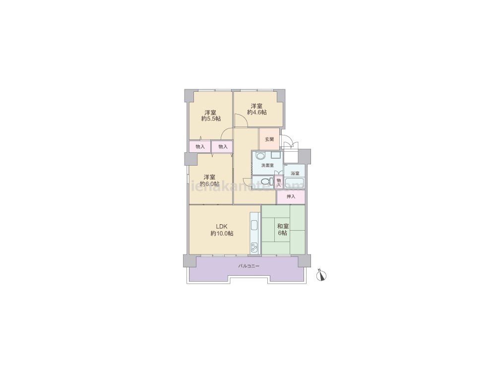 専有面積75.07平米の4LDK。センターインのプラン。キッチンは壁付けのオープンタイプ。ダイニング・キッチンと洋室6帖が続き間で、約16帖の一つの空間としても使用可能。洋室4.6帖に収納スペースは無し。バルコニーはゆとりがあり、ガーデニングも楽しめます。