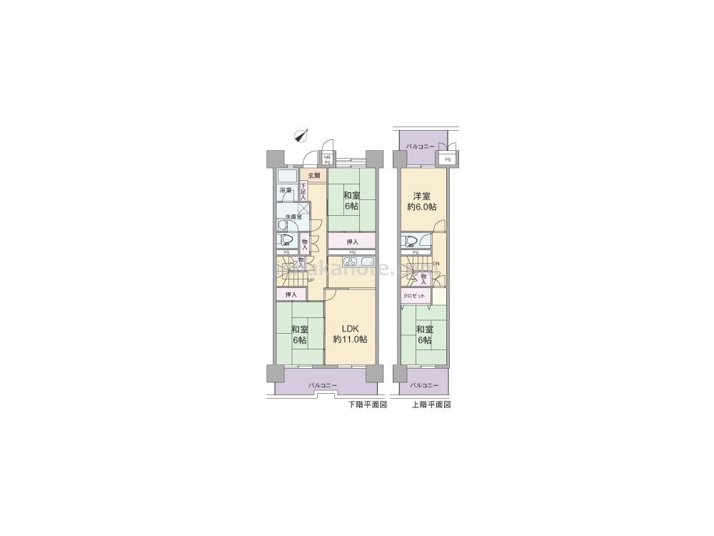 専有面積99.69平米の4LDK。上階部分は南東・北西両面バルコニー付き。LDと和室が続き間になっており、和室はくつろぎのリビングスペースとして利用できそうです。全室6帖以上でゆとりの広さ。収納スペースが充実しています。