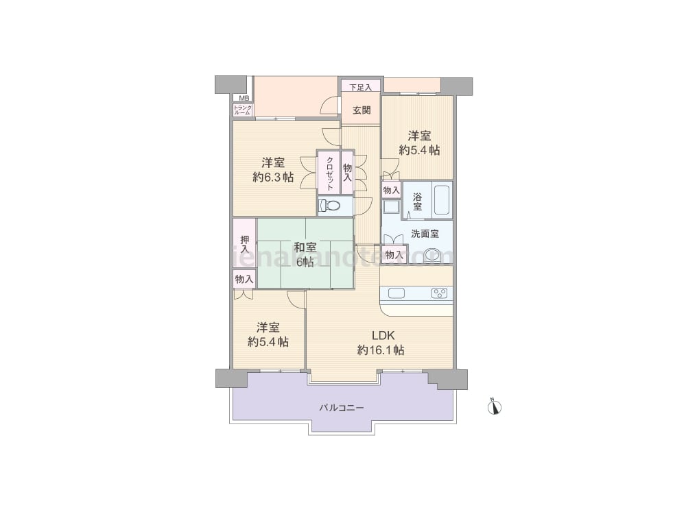 専有面積86.93平米の4LDK。玄関前にはトランクルーム付き。キッチンはカウンタータイプで、家事をしながら家族の様子を窺うことができます。和室6帖がLDKに隣接しており、襖を開放すれば、家族団らんのスペースとしても活躍しそうです。各室に収納スペース付きで、廊下にも物入付きです。