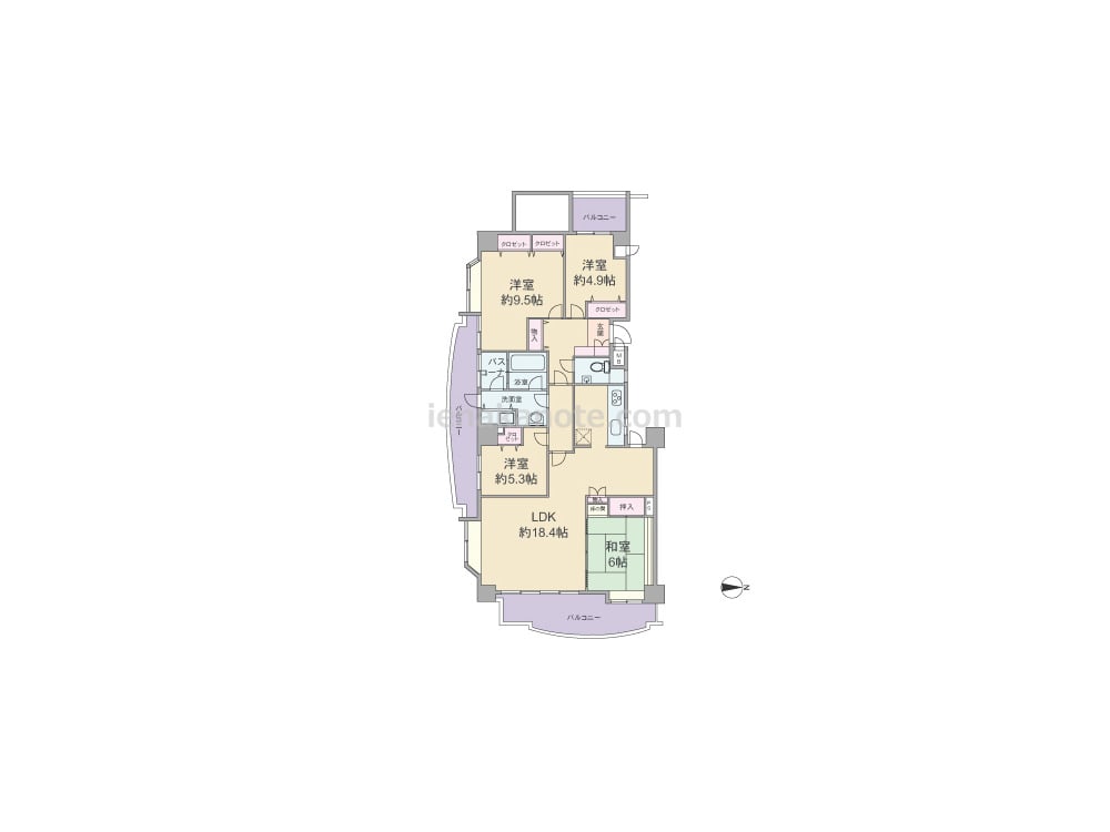 専有面積118.01平米の4LDK。東、南、西の3カ所にバルコニー付き。LDKは、2面採光で、和室と続き間の為、約24.4帖の一つの空間としても使用可能。洗面室と浴室は南側のバルコニーに面して配置され、浴室横にはバスコーナーがあります。主寝室はゆとりの約9.5帖大。各部屋に収納スペースがあります。