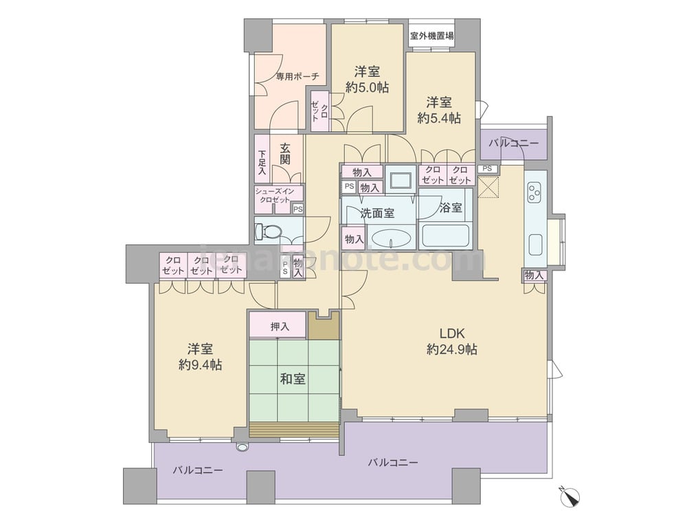 専有面積115.96平米の4LDK。玄関前にポーチ付き。キッチンは独立タイプですが、窓と勝手口があるため、料理中も快適です。リビング・ダイニングは約20.1帖とゆったり。4.5帖の和室が隣接しており、襖を開放すれば約24.6帖の空間としても利用できます。主寝室は約9.4帖。各室に収納スペースがあり、玄関や廊下、洗面室にも物入付きで、収納が豊富です。