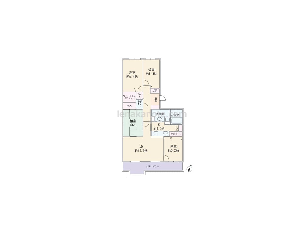 専有面積89.25平米の4LDK。センターインのプラン。南側ワイドスパンで、LDKと洋室5.2帖がバルコニーに面しています。キッチンはカウンタータイプ。LDKと和室が続き間で、約23.5帖の一つの空間としても使用可能。主寝室は約7.4帖大で、ウォークインクロゼット付き。バルコニーはゆとりがあります。