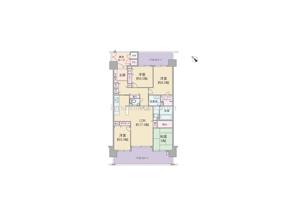 専有面積105.10平米の4LDK。玄関前にポーチがあり、ポーチ内にトランクルーム有り。廊下がクランク状になっており、玄関から室内が見渡せず、プライバシーが確保されています。ワイドスパンのプランで、両面にバルコニー付き。全居室がバルコニーに面し、開放感有り。約8帖の主寝室にウォークインクロゼット付き。南西側のバルコニーは出幅があり、ガーデニングやテーブルセットを出して、くつろぐことも出来ます。