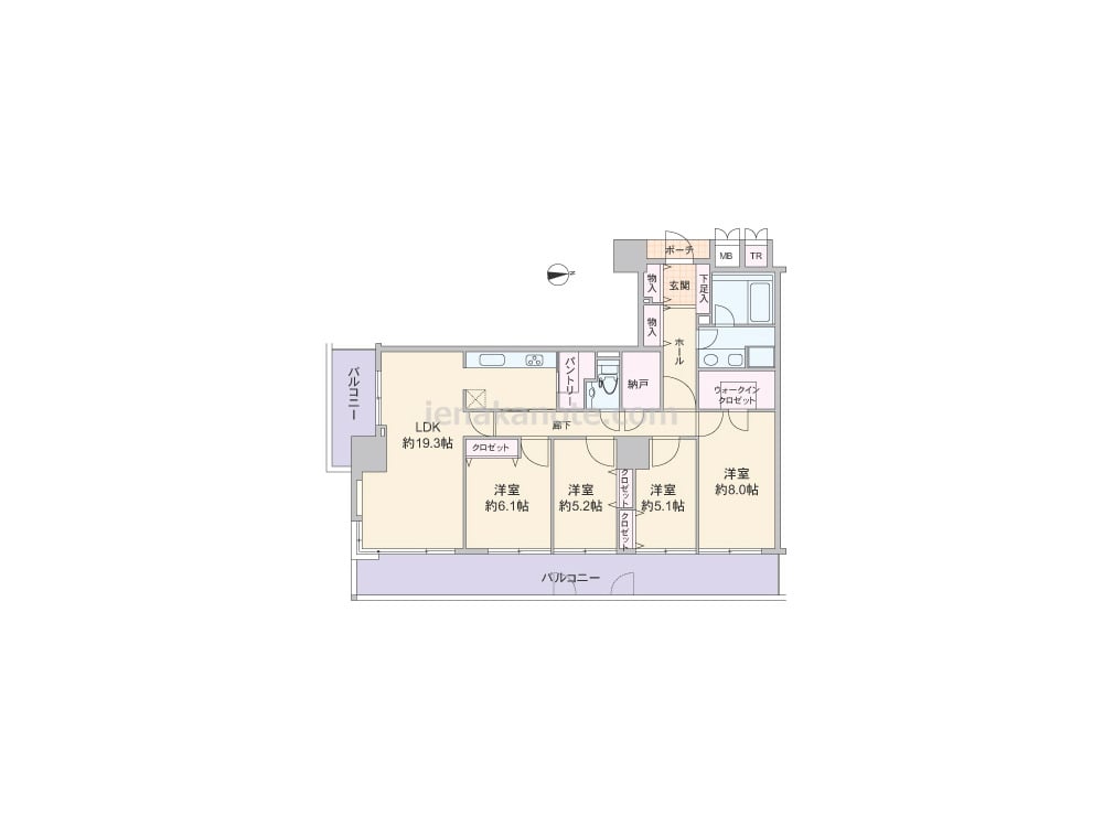 専有面積109.97平米の4LDK。LDKは広々19.3帖、キッチンは独立タイプ。ウォークインクロゼットやパントリー、トランクルーム、玄関収納、納戸などゆとりの収納スペースが魅力です。洗面はダブルボウルで、忙しい朝の支度も快適。全室がバルコニーに面し明るく、バルコニーは広いため、ガーデニングなどもゆったりと楽しめます。