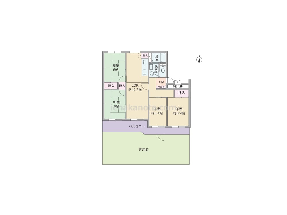 専有面積80.33平米の4LDK。専用庭付き・ワイドスパンのプランで、LDKを含む4部屋が南向き。LDK約13.7帖は南北両面に窓があり、通風にすぐれています。キッチン横には便利な物入付き。和室2部屋はLDKを通って出入りします。洋室約5.4帖には収納スペースが無いため、収納家具を設けるなどの工夫が必要。専用庭はガーデニングスペースやアウトドアリビング、家庭菜園など様々な楽しみ方が出来ます。
