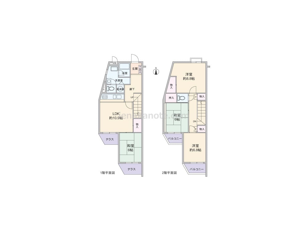 専有面積104.28平米の4LDK。メゾネットタイプで、1階にはテラス、2階にはバルコニーが付いています。水回りはワンフロアに集約されており、家事効率の良いプラン。全室に収納は無いものの、LDKや2階廊下に物入れがあり、収納スペースが豊富です。洗面室に窓があります。