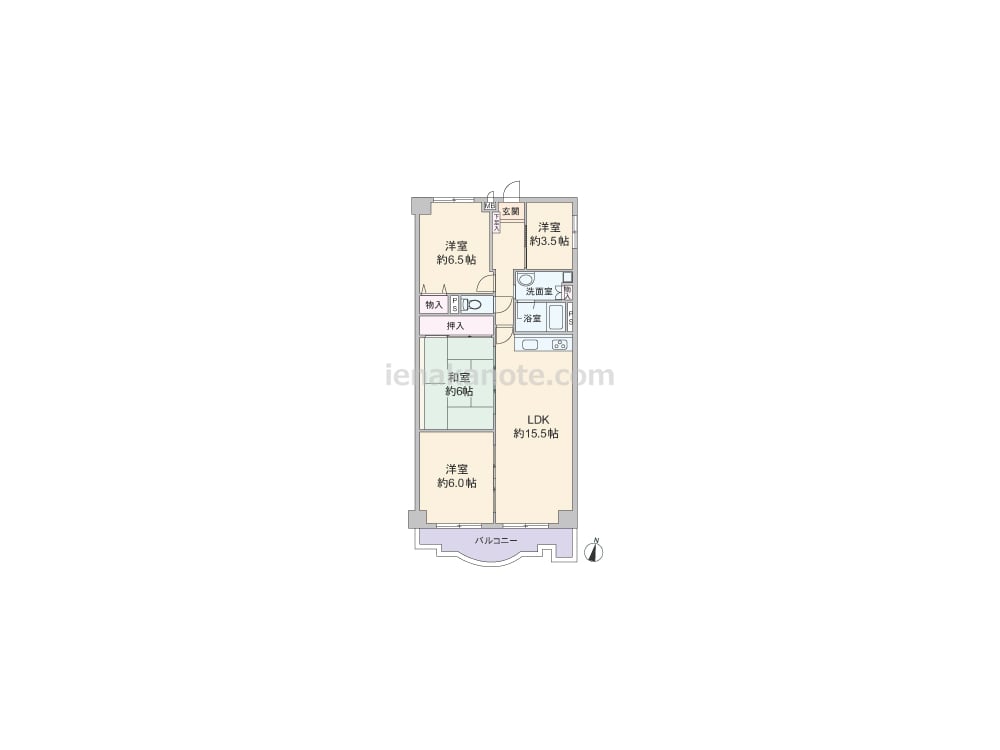 専有面積84.50平米の4LDK。LDK約15.5帖と和室6帖・洋室約6.0帖が続き間になったプラン。それぞれ個室に利用したり、扉を開放してLDKを広く使うなどフレキシブルに使えます。キッチンはI型の壁付け・オープンタイプ。洋室約6.5帖と和室6帖に収納スペースが設けられ、洋室約3.5帖は書斎や納戸、趣味のスペースなど色々な用途に使えます。