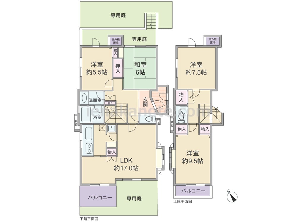 専有面積112.51平米の4LDK。センターイン、メゾネットプラン。南北両面に専用庭付き。キッチンはI型の独立タイプで、家事動線に配慮されたツーウエイ。LDKは開放感のある二面採光。浴室にも窓があり、換気がよく快適です。各フロアにトイレ付き。上階の居室は7帖以上の広さがあり、主寝室は約9.5帖大。専用庭はガーデニングや子供の遊び場によさそうです。