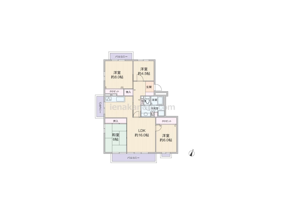 専有面積97.20平米の4LDK。センターインのプラン。キッチンとリビングダイニングが分かれて配置されているため、リビングスペースはくつろぎの空間を演出できます。洋室約6.0帖と和室6帖はLDKを通って行き来する造り。和室の襖を開放すれば、リビングスペースをより広く使えます。洋室約4.5帖にはクロゼットがありませんが、室内廊下、洗面室に物入付き。洗面室を通ってトイレに出入りする造りのため、洗面室・トイレ使用時の動線が重なっています。全部で4カ所あるバルコニーは、ガーデニングを楽しむのによさそうです。
