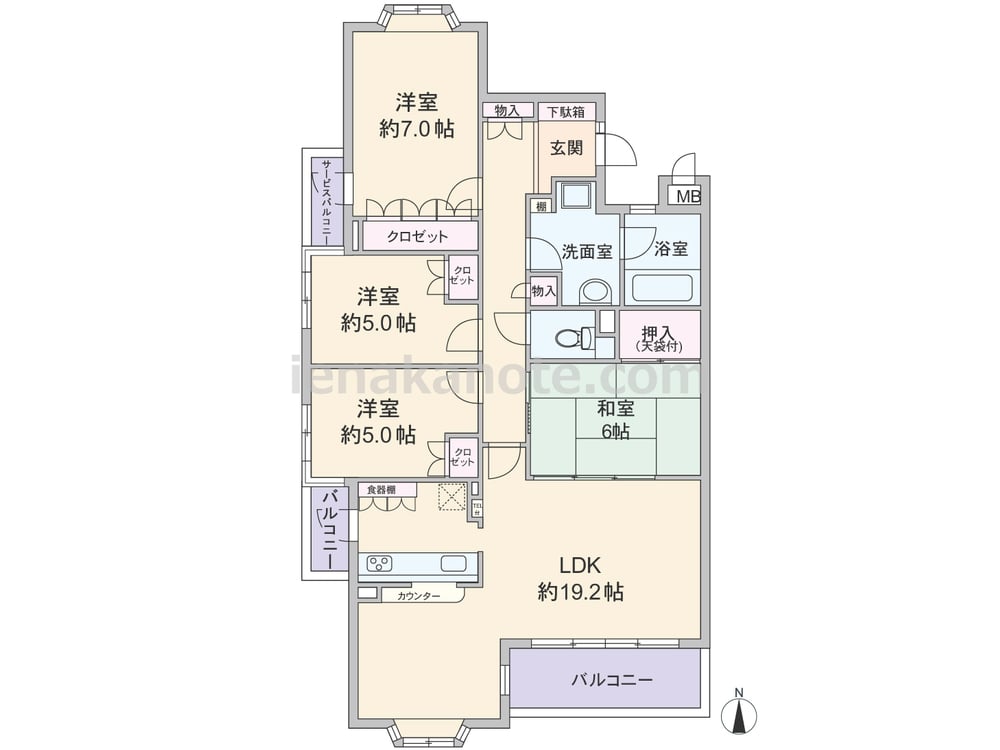 専有面積94.07平米の4LDK。共用廊下に直接面する居室が無く、玄関からリビングが見通せないプライバシーに配慮されたプラン。約19.2帖のLDKには和室が隣接しており、扉を開放してリビングの延長として使用したり、小さいお子様の遊び場スペースにしたりと、生活シーンに合わせてフレキシブルに活用出来ます。キッチンはカウンタータイプ、食器棚付きで、家事をしながら家族とコミュニケーションが取りやすい配置。便利なキッチンバルコニーも付いています。主寝室は約7帖の広さがあり、2面採光。浴室にも窓があり、換気がしやすく快適です。