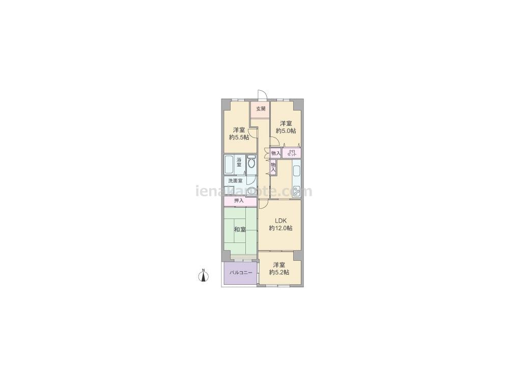 専有面積81.67平米の4LDK。LDKは和室と洋室が続き間で、扉を開放して空間をつなげて使ったり、区切ったりと生活シーンに合わせてフレキシブルに使用出来ます。キッチンは独立型。洗面室からトイレに出入りする配置です。収納スペースが洋室約5.2帖と約5.5帖には無いので、家具を設置するなど工夫が必要です。