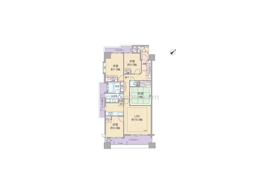 専有面積90平米の4LDK。共用廊下に直接面する居室の窓が無く、玄関前に専用ポーチが付いたプライバシー重視のプラン。LDKはゆとりの約16.0帖大。生活感を感じさせやすいキッチンは独立した配置のため、リビングダイニングはくつろぎの空間を保てます。和室6帖には窓がありませんが、室内廊下からも出入りが可能なため客間に利用したり、LDK側の襖を開放して家族団欒のくつろぎのリビングスペースにするなどフレキシブルに使える一室。収納スペースが各所に設けられ、洋室約7.0帖と洋室約5.0帖のクロゼットには上部に棚が、和室には吊押入とガラス戸が付いた収納スペースが付いています。バルコニーが3カ所あり、北西側のバルコニーにはトランクルーム付き。南東側のバルコニーはスロップシンクがあり、ガーデニングを楽しむのにぴったり。西側バルコニーはキッチンと洗面室からアクセスが可能な家事動線にすぐれた造り。浴室にも窓があり換気がしやすく快適です。