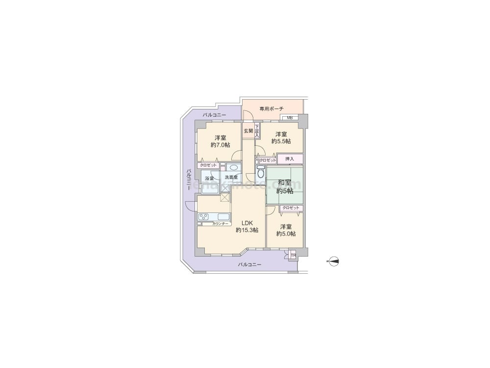 専有面積81.60平米(トランクルーム面積0.47平米含む)の4LDK。玄関前に専用ポーチ、居室前にはバルコニーがあるので共用廊下を通行する人の気配を気にせず生活できます。LDKと続き間になった和室は個室利用はもちろん、襖を開放してLDKの延長としたり、おもちゃを置いて子供の遊び場スペースに利用してもよさそうです。カウンター付きのキッチンはバルコニーへ出入り可能な配置。各室の収納の他、バルコニーにトランクルームがあります。浴室には窓付きです。