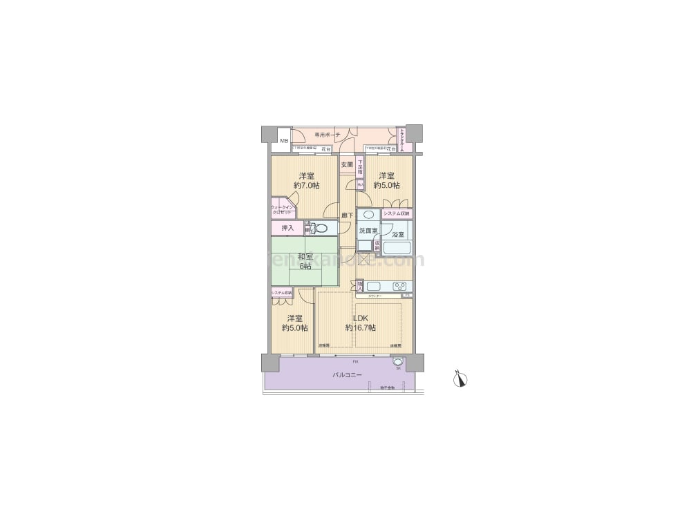 専有面積83.60平米の4LDK。玄関前の専用ポーチは共有廊下を通行する人の気配が感じにくい配置で、トランクルームも付いています。LDKは約16.7帖、主寝室は約7.0帖+ウォークインクロゼット付きのゆとりあるプラン。カウンタータイプのキッチンは家事をしながら家族とコミュニケーションが取れます。各室に収納があり、室内は柱の出っ張りが無いのでスペースを有効活用できます。バルコニーは約15.70平米のスロップシンク付き。気軽にガーデニングを楽しめます。