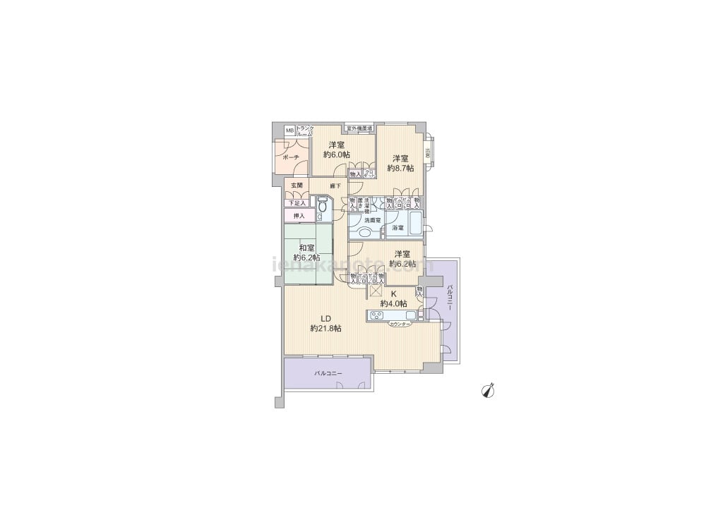 専有面積112.75平米の4LDK。玄関前に専用ポーチ付きで共有廊下に面した窓が無い、プライバシーが十分に保たれたプラン。2面採光のLDKと主寝室は開放感があります。LDKと続き間になった和室は襖を開放して家族団欒のスペースにしたり、おもちゃを置いて小さい子どもの遊び場スペースにしたりと生活シーンにあわせてフレキシブルに活用出来ます。キッチン横に勝手口があり、バルコニーは、一時的なゴミを置くスペースとしても使用可能。主寝室は約8.7帖の広さがあり、洗面室へアクセス出来ます。浴室には窓があり換気がしやすく快適。収納スペースが各所に設けられています。
