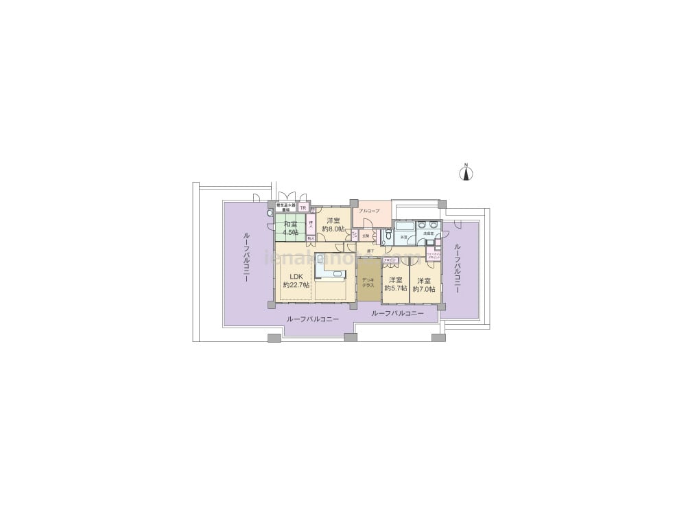 専有面積106.86平米(トランクルーム面積1.21平米を含む)の4LDK。3方がルーフバルコニーに面し、中央部分にはデッキテラスの付いた明るく開放的なプラン。玄関からリビングが見通せないプライバシーに配慮された配置です。リビングは約22.7帖大とゆとりがあり、キッチンはL字型のカウンタータイプ。LDKと続き間になった和室の襖を開放すれば、約27.2帖大の家族団欒のリビングスペースとしても使える他、おもちゃを置いて小さい子どもの遊び場やお昼寝スペースなど、家事をしながら育児をするのに便利な一室としても使えます。各部屋に収納が設置され、室内に柱の出っ張りが無いのでスペースを有効活用できます。トイレには手洗いカウンター付き。ダブルボウルの洗面台は、忙しい朝の支度に便利です。トイレと浴室に窓があり、換気がしやすく快適。広々としたバルコニーにはスロップシンクがあり、ガーデニングはもちろん子供用プールを出して子供を遊ばせたり、テーブルセットを出してくつろいだりと色々と楽しめます。