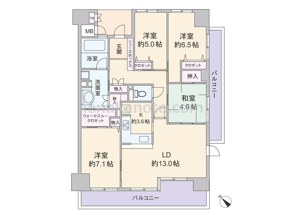 専有面積95.56平米の4LDK。玄関前にアルコーブ、室内廊下がクランク型になっているプライバシー面に配慮された配置。リビング・ダイニングの窓は開放感のあるコーナーサッシが用いられています。和室の引き戸を開ければ家族団欒のリビングスペースに利用可能。和室は室内廊下側にも扉があるので個室としても使いやすくなっています。カウンタータイプのL字型キッチンは家事中も家族と会話を楽しめる配置。主寝室と洗面室の間にウォークスルークロゼットがあり、浴室には換気窓が付いています。